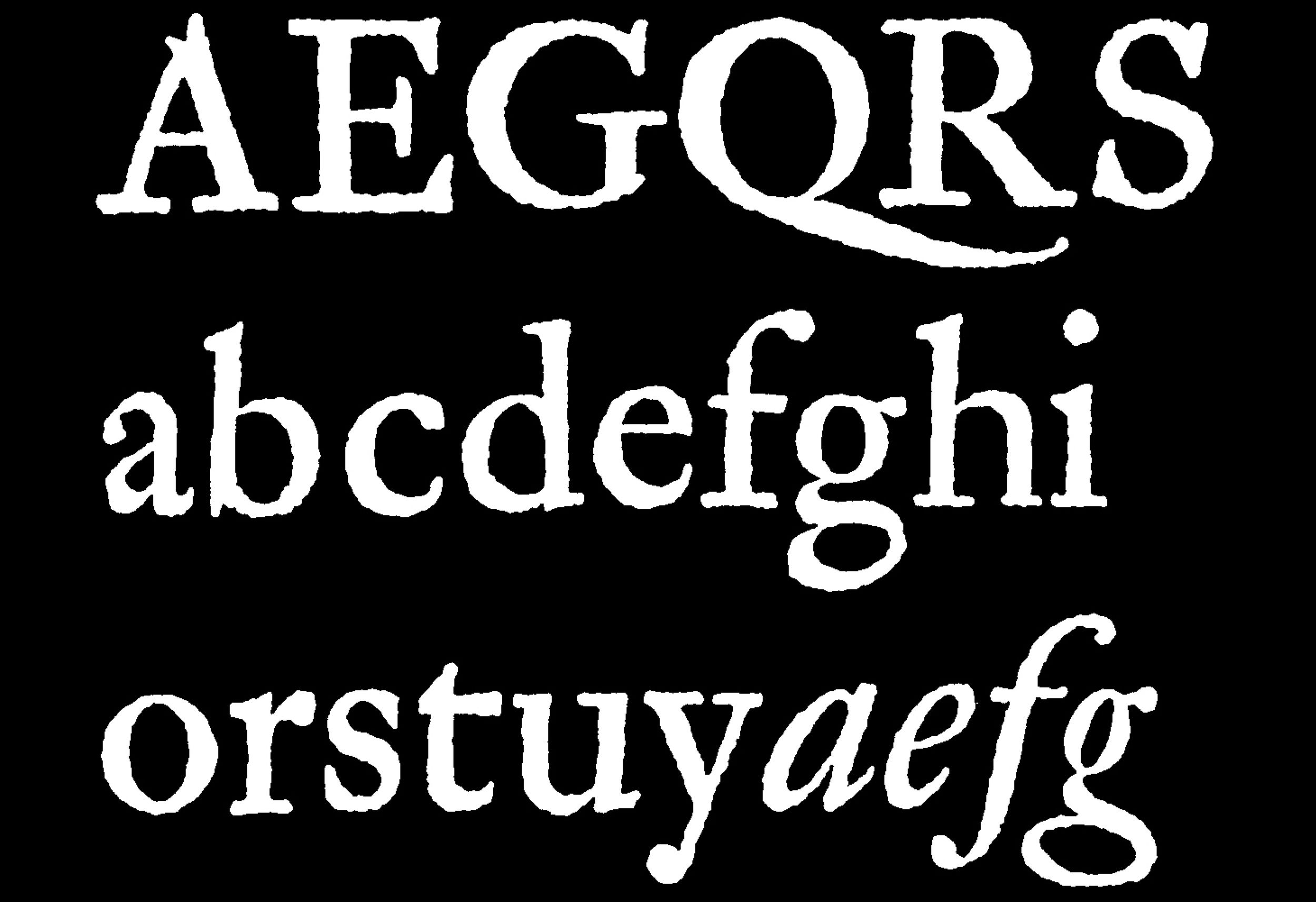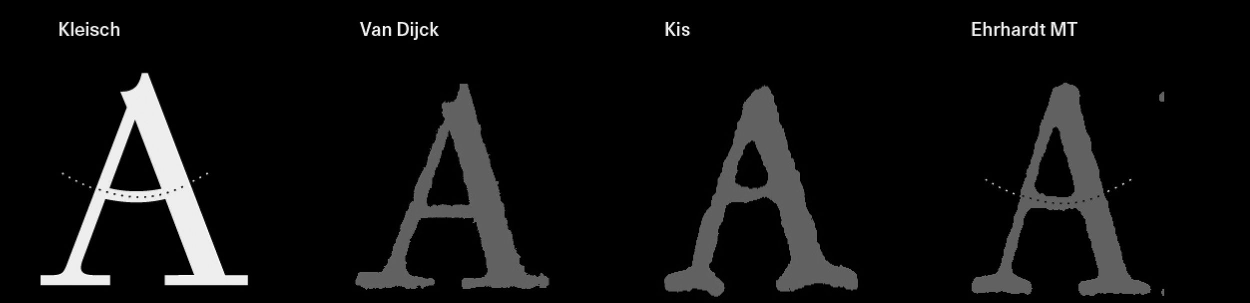 The design of the curved crossbar in Kleisch’s ‘A’ pays homage to the distinctive ‘A’ found in Ehrhardt MT (a renowned Kis revival from Monotype). This feature likely originates from the ‘A’ in Kis’s Goote Text, allowing additional room in the restricted counter space limited by the high crossbar.