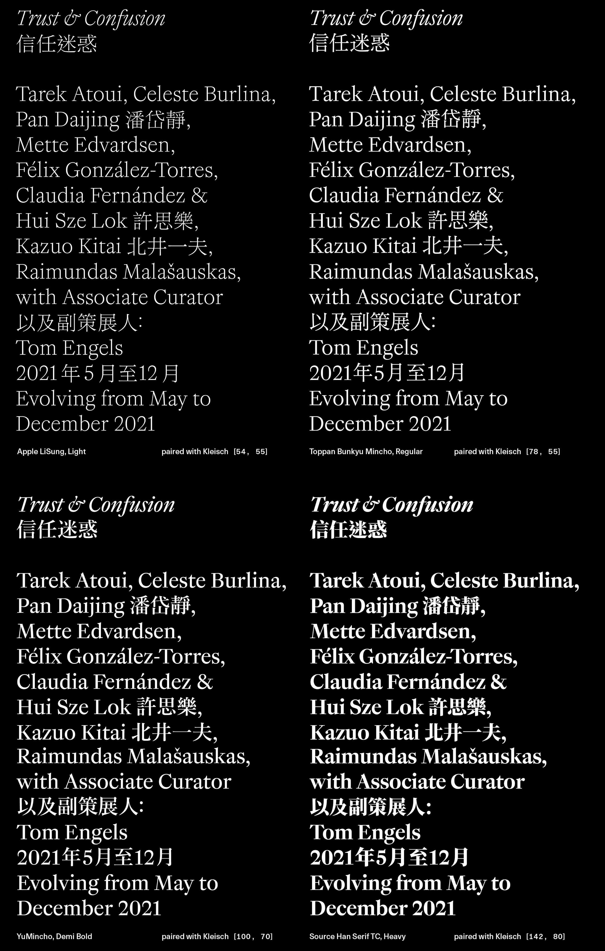 In another series of tests for the versatility of Kleisch, I combined various instances in a sample layout with bi-lingual text setting. In each case, weight and contrast were fit to match the the grey-scale of the respective typefaces, including Apple LiSung Light, Toppan Bunkyu Mincho Regular, YuMincho Demi Bold and Source Han Serif TC Heavy.