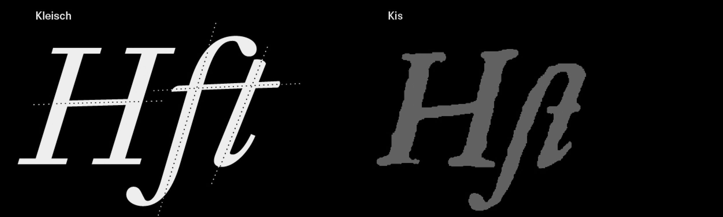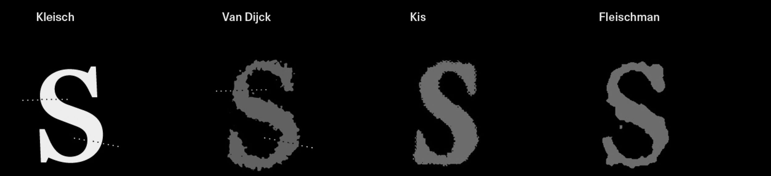 The Baroque ‘s’ is characterised by a slight rotation of the nib on the lower stem, a feature typically softened in the Neoclassical period. The ‘s’ forms in Kis and Van Dijck are marked by asymmetrical terminals. Baroque-style contrast is preserved in Kleisch, while the terminals align with the Neoclassical tradition.