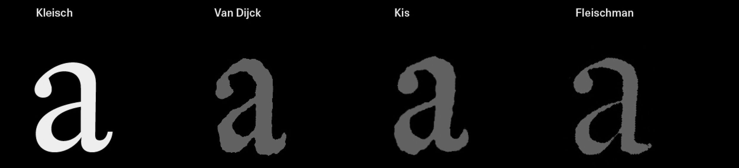 The ‘a’ in Kleisch synthesises elements from Van Dijck, Kis and Fleischman, featuring a top-heavy proportion and a slightly tilted shoulder of Baroque types. The top terminal is rendered with subtle ambiguity between broad nib and expansion nib.