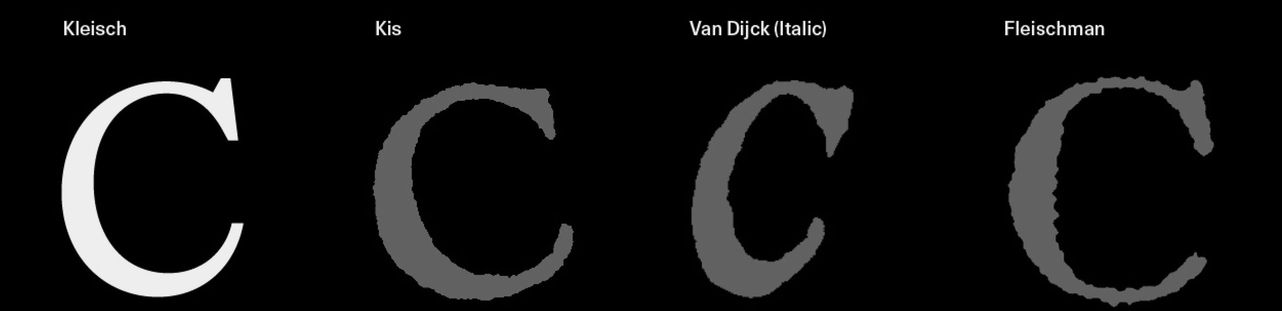 During the Baroque and Neoclassical periods, a more dynamic ‘C’ emerged in Roman capitals, influenced by Italic forms and seen in the work of Fleischman and Kis. With its abrupt stroke termination, this form shares a visual trait found in CJK calligraphy, and it inspired the design of the ‘C’ in Kleisch.