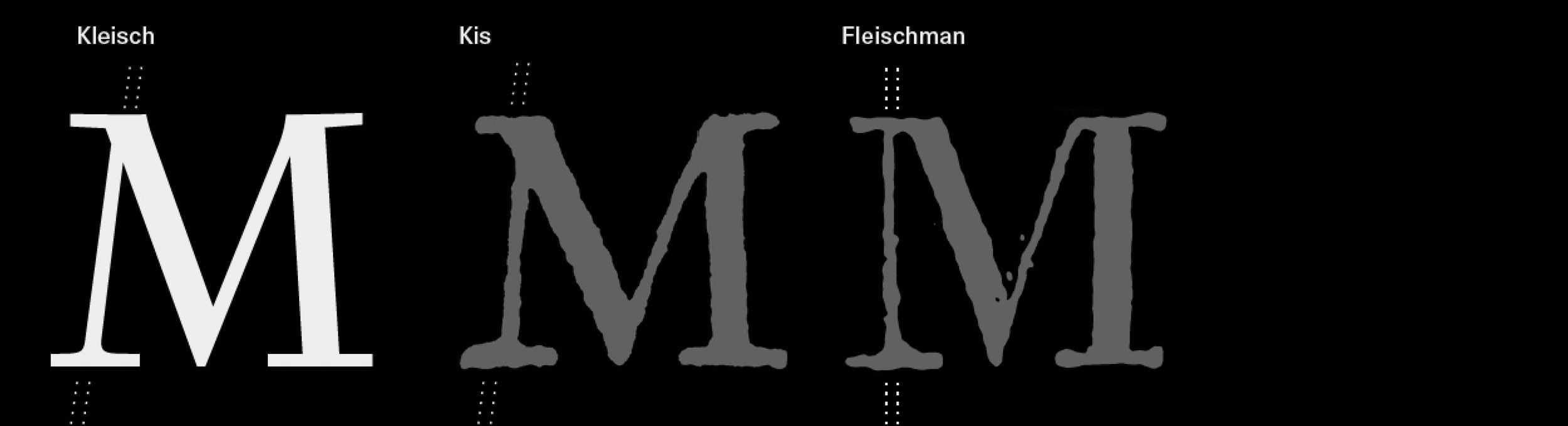The ‘M’ is an important indicator to reveal the identity of a serif typeface. In Neoclassical types, the stems of the ‘M’ are generally vertical, while in Baroque types, they tend to tilt inward. The final design decision for Kleisch’s ‘M’ places it closer to its Baroque roots.