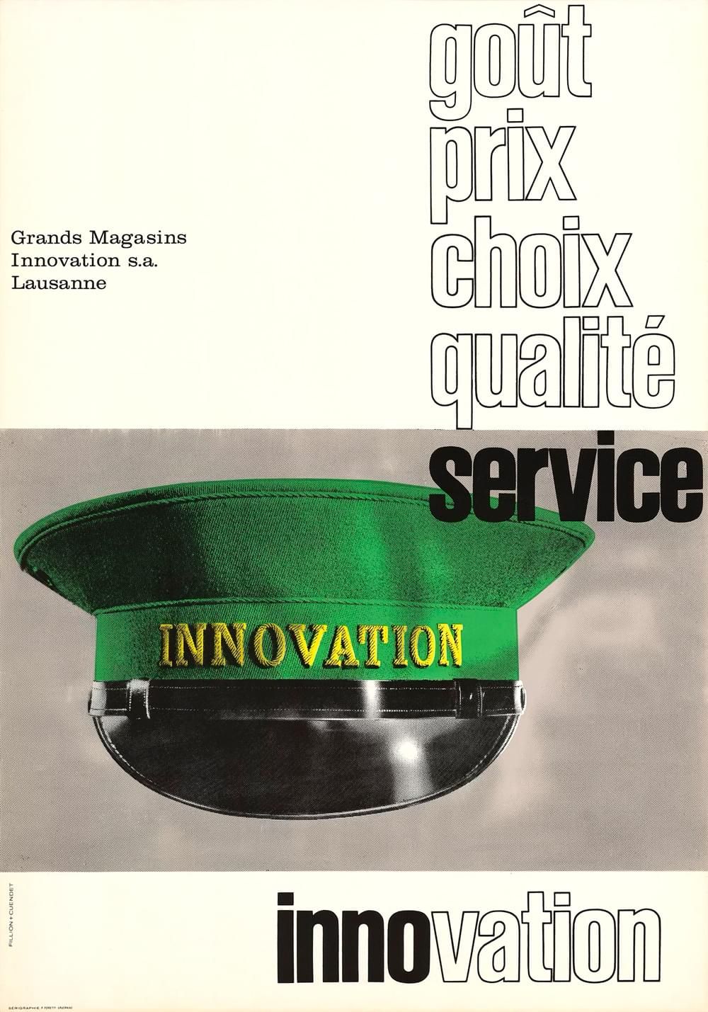 A less programmatically charged, more profane anonymity of the designer was standard in the emerging advertising agencies in the graphic design industry, following the 1960s. It also became quite common to adapt or alter designs that had been created by others. Ruder’s commercially successful wood type is no exception to this rule. A series of silk-screened posters for the department store Grand Magasins lnnovation in Lausanne, Switzerland, features a slightly modified Ruder-Schrift in a mix of solid and outline shapes, custom-made by local designers and unique to this particular client.