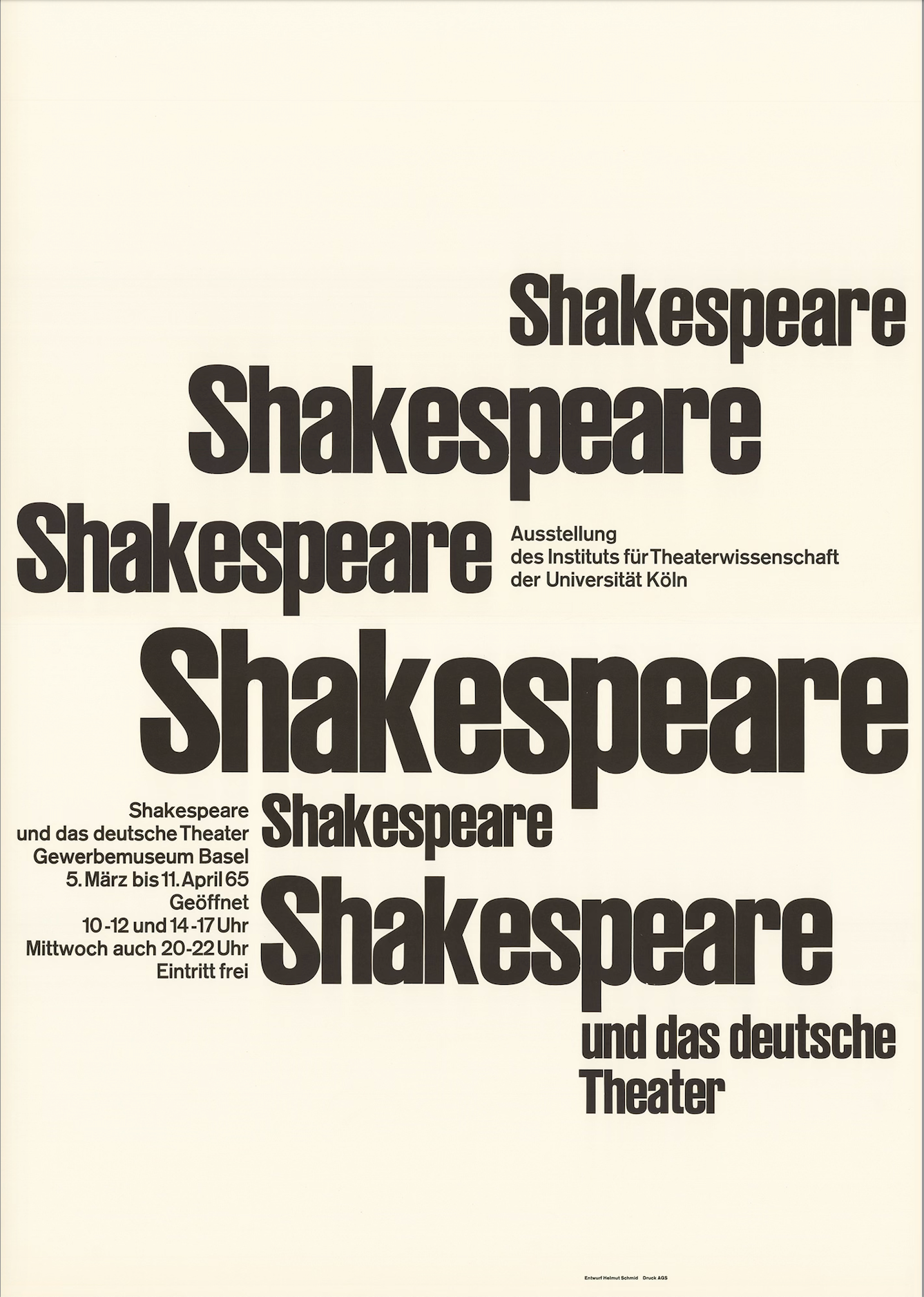 1965 — Both versions of the same wood type, set side by side (inadvertently?) on a poster by Helmut Schmid, one of the most prominent Ruder students at AGS. The first line is the only one composed in the Early Ruder-Schrift.